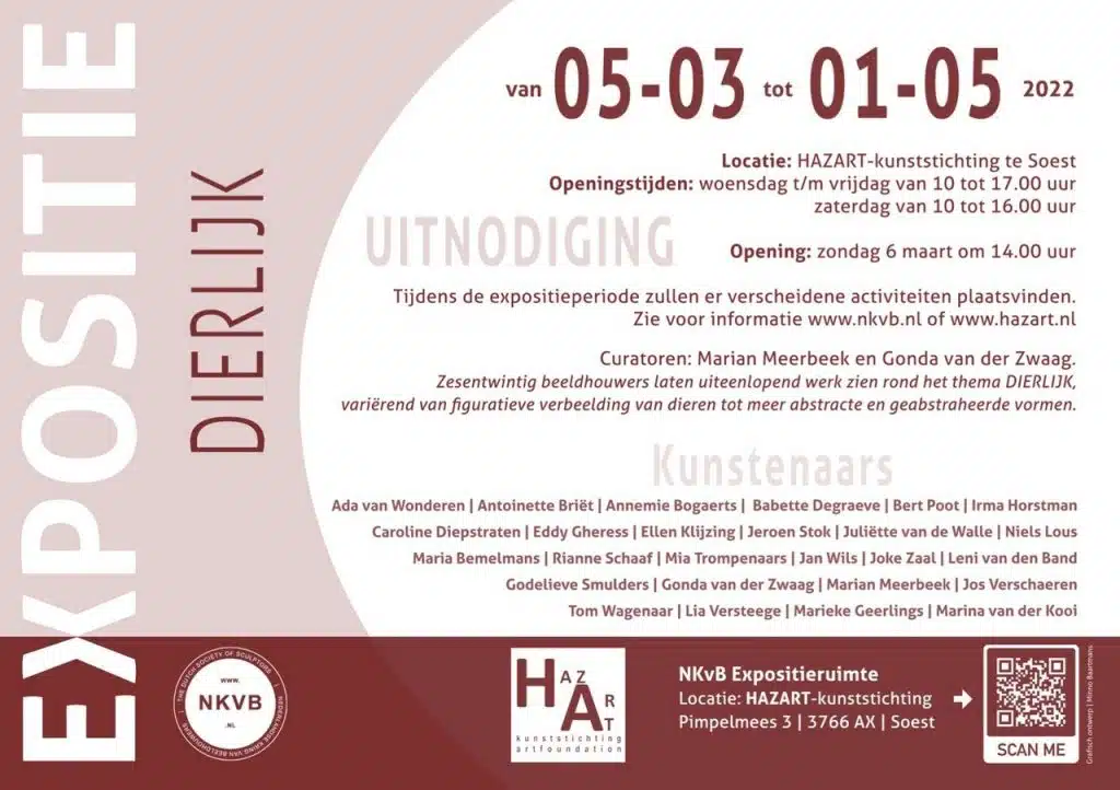 Van 5 maart 2022 tot 1 mei 2022 loopt de expositie Dierlijk in de galerie van de Nederlandse Kring van Beeldhouwers.