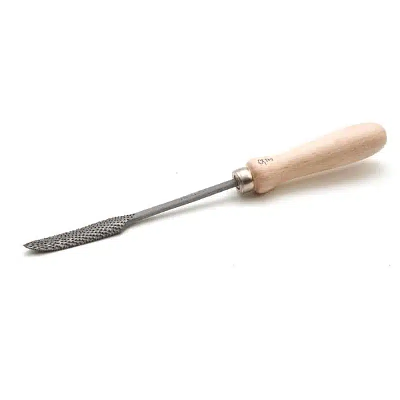De handgesmede en handgekapte rasp is voorzien van een houten heft en wordt geleverd in de maat 15  of 25 cm. De rasp is geschikt voor het bewerken van zachte en middelharde steensoorten en hout. Leverbaar in 5 modellen.
