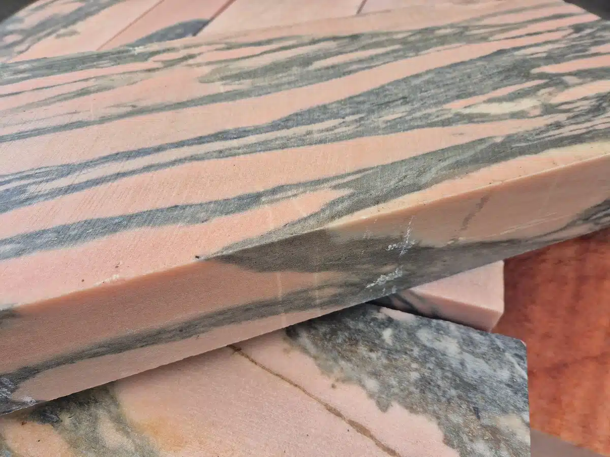 Portugees marmer, van lichtroze tot bijna zuurstokroze met scherpe grijs-zwarte tekeningen. Hardheid ca. Mohs 3.5 – 4 en goed te polijsten.