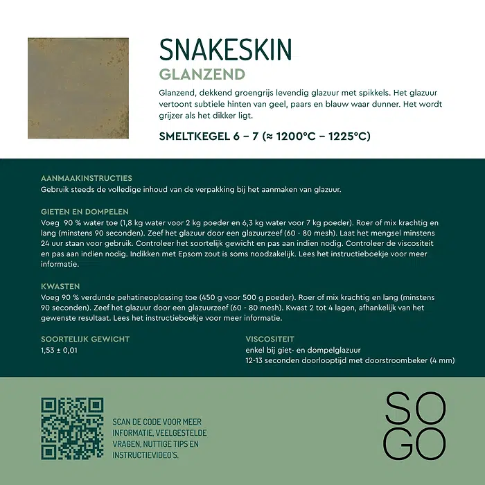 Snakeskin is een glanzend, dekkend groengrijs levendig glazuur met spikkels. Het glazuur vertoont subtiele hinten van geel, paars en blauw waar dunner. Het wordt grijzer als het dikker ligt.